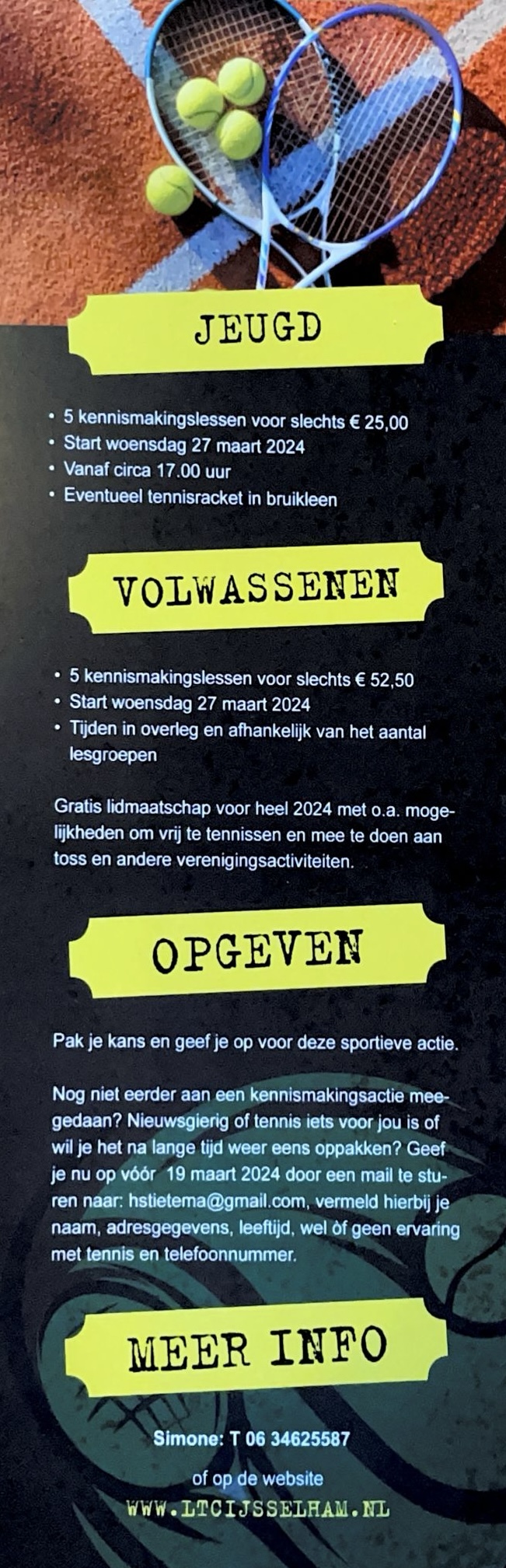 Nog niet eerder aan een kennismakingsactie meegedaan? Nieuwsgierig of tennis iets voor jou is? Geef je dan nu op. Doe dit vóór 15 maart 2026 door een e-mail te sturen naar [email protected]. Vermeld hierbij je naam, adresgegevens, leeftijd, wel of geen ervaring met tennis en telefoonnummer.